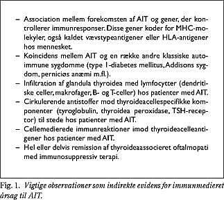 Disse kriterier kan være opfyldt ved laboratoriestudier, ved dyreforsøg eller fra kliniske studier. Kun få af de såkaldte autoimmune sygdomme opfylder alle fire kriterier. Alle fire kriterier er mere eller mindre opfyldt ved AIT, men herudover eksisterer der anden indirekte evidens (Fig. 1 ).