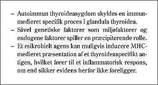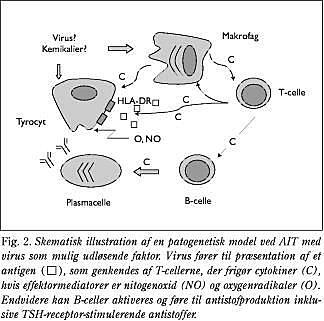 Cytokiner spiller en rolle i patogenesen til AIT, hvor en ukendt trigger fører til præsentation af et protein, der opfattes som antigen af antigenpræsenterende celler eller præsenteres af tyrocytterne selv med MHC klasse II-ekspression på overfladen (Fig. 2 ). T-celler genkender antigenet og frigør cytokiner. B-celler kan aktiveres og føre til antistofproduktion inklusive produktion af TSH-receptor-stimulerende antistoffer, som kan være årsagen til hyperfunktionen ved Graves' sygdom. Ingen enkelt trigger er fundet at kunne forårsage udviklingen af AIT. Udviklingen af Hashimotos thyroiditis eller Graves' sygdom må afhænge af balancen mellem Th1- og Th2-deriverede cytokiner. Aktiveringen af makrofager og T-celler medfører således en kaskade af begivenheder, der er medieret af proinflammatoriske cytokiner. En række sekundære inflammatoriske mediatorer for eksempel frie iltradikaler og reaktive nitrogenforbindelser bidrager yderligere til at vedligeholde eller forstærke inflammationen. Blandt de proinflammatoriske cytokiner anses interleukin 1 (IL-1)β , tumornekrotiserende faktor (TNF)-α , IL-8 og interferon (INF)-γ for at være de vigtigste, mens transforming growth factor (TGF)β , IL-4 og IL-10 omfatter de mest betydningsfulde immundæmpende, regulatoriske cytokiner. En ugunstig balance mellem stimulerende og inhiberende faktorer kan vedligeholde den inflammatoriske proces. Såvel in vitro- som in vivo-studier af thyroideaaksen på hypothalamus- og hypofyseniveau samt på thyroideaniveau har vist, at høje koncentrationer af de proinflammatoriske cytokiner IL-1β , TNF-α og INF-γ (2) har en hæmmende indvirkning på thyroideafunktionen; en indvirkning, som kan forklare hypofunktionen ved Hash imotos sygdom.
