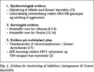 Flere studier tyder på, at en eksogen faktor kan være en infektion, hvor det infektiøse agens provokerer den autoimmune reaktion ved at inducere ændret ekspression af autoantigener på målcellen eller krydsreaktion mellem antigene komponenter af det infektiøse agens, og antigener på målorganet kan være til stede. Diverse virus (influenza B virus, rubellavirus, retrovirus) har været beskrevet som associeret med AIT (11). Tilfælde med kongenit rubella associeret med enten Hashimotos thyroiditis eller Graves' sygdom foreligger (12), men der er ikke evidens for aktiv rubellainfektion på tidspunktet for dysfunktionen af glandula thyroidea. Graden af evidens for at infektiøse agenser indgår i patogenesen til Graves' sygdom fremgår af Fig. 4 . Der er kun en rapport i litteraturen om ophobede tilfælde af Graves' sygdom (13). En øget frekvens af antistoffer over for influenza B-virus har været påvist hos patienter med Graves' tyrotoksikose (14). Graves' sygdom har endvidere været sat i forbindelse med Yersinia enterocolitica, hvor Yersinia -antistoffer er påvist hos op til 72% af patienterne med Graves' sygdom (15, 16), og et T-celle-medieret immunrespons over for Yersinia enterocolitica har været rapporteret i øget hyppighed hos patienter med Graves' sygdom (17). Ciampolillo et al (18) har påvist retrovirale sekvenser i DNA isoleret fra glandula thyroidea fra fem patienter med Graves' sygdom, mens Jaspan et al (19) har beskrevet udvikling af Graves' sygdom hos genetisk prædisponerede ved samtidig påviselige antistoffer over for retrovirus. Disse resultater har imidlertid ikke kunnet konfirmeres af andre (20, 21). I et dyreforsøg (med en obes kyllingestamme) med arvelig spontan AIT har der kunnet påvises ekspression af et nyt retrovirus i afficerede kyllingers thyroideavæv, men ikke i raske kontrolpersoners (22). I forhold til en mulig sammenhæng mellem retrovirus og AIT skal det nævnes, at der er beskrevet en høj grad af homologi imellem HIV-1 nef-proteinet og TSH-receptoren hos mennesker (3). Også hvad angår Hashimotos thyroiditis er der på et tilsvarende evidensniveau beskrevet sammenhæng med viral eller bakteriel (23) infektion. Der har været påvist et fald i diverse virale antistoftitre efter et udbrud af subakut stum thyroiditis (24). Subakut thyroiditis De Quervain opfattes som værende udløst af et virus, idet der kan påvises forhøjede virale antistoftitre (25), hvorefter et autoimmunt fænomen formentlig udløses (11).
