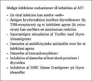 Hos individer, der er prædisponerede for at få AIT, er mekanismerne molecular mimicry (måske over for retrovirus (3)), polyklonal T-celle-aktivering og induktion af MHC antigener på thyroideaceller muligvis de mest sandsynlige. En dyrket rottethyroideacellelinje er vist at kunne udtrykke MHC klasse II-antigener, der er induceret af retrovirus type 1 og 3 (4), og cytomegalovirus er vist at kunne inducere HLA-DR-ekspression i primærkulturer af dyrkede thyroideaceller (5). Det kan formentlig variere fra individ til individ om en eller flere mekanismer opererer.