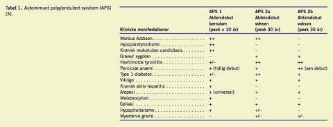 I Tabel 1 er skitseret yderligere symptomer og sygdomme ved henholdsvis APS 1, APS 2a og APS 2b.