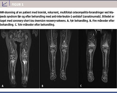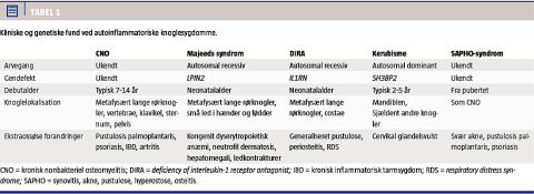Kronisk nonbakteriel osteomyelitis (CNO) er en ikkeinfektiøs inflammatorisk knoglesygdom, der har ukendt ætiologi og primært rammer børn og unge voksne. Sygdommen hører til de autoinflammatoriske sygdomme og karakteriseres ved mono- og multifokale knoglelæsioner, som medfører smerte og lokal hævelse og har et uforudsigeligt forløb med periodevis forværring og ofte spontan bedring. I forhold til nomenklatur er der endnu ikke konsensus. Anvendte betegnelser for sygdommen er, ud over CNO, kronisk, rekurrent, multifokal osteomyelitis (CRMO), ikkebakteriel ostitis og akut/kronisk ikkebakteriel ostitis. Såfremt der er tale om multifokale læsioner, har betegnelsen CRMO fortrinsvis været anvendt, men i erkendelsen af at tilfælde med kun en enkelt fokal læsion ikke kan skelnes fra de multifokale tilfælde, bruges betegnelsen CNO mere og mere [1, 2]. Den gennemsnitlige debutalder er 9-11 år, og piger rammes oftere end drenge [1-3]. Diagnostiske kriterier er ikke valideret, men er bl.a. foreslået i retrospektive studier [1, 2]. Diagnosen baseres på en kombination af kliniske, radiologiske og histopatologiske fund. Der findes ingen diagnostisk test for CNO, og sygdommen skal udelukkes fra andre differentialdiagnoser som bakteriel osteomyelitis, knogletumorer, lymfomer og Langerhanscellehistiocytose. CNO dækker ud over betegnelsen CRMO også andre autoinflammatoriske knoglesygdomme som synovitis, akne, pustulose, hyperostose, osteitis (SAPHO)-syndrom, Majeeds syndrom, deficiency of interleukin-1 receptor antagonist (DIRA) og kerubisme, som vil blive omtalt her.