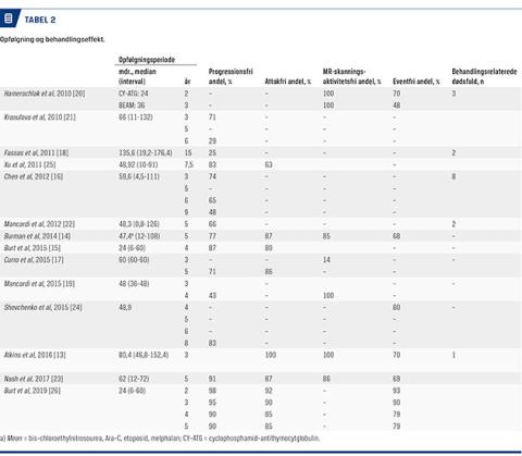 I denne artikel er der inkluderet 14 publicerede kliniske studier [13-26], der omhandler AHST af patienter med MS siden 2010 (Tabel 1 og Tabel 2).