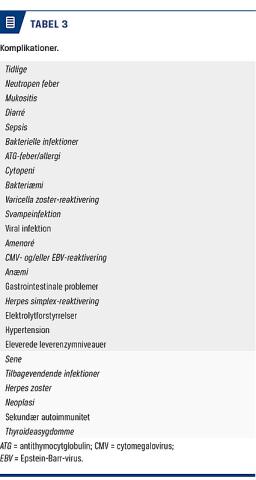 Komplikationer i forbindelse med AHST inddeles i tidlige (< 100 dage efter AHST) og sene (> 100 dage efter AHST) (Tabel 3). De tidlige komplikationer opstår oftest i den neutropene fase, hvor patienten er sårbar over for infektioner og i risiko for at udvikle sepsis. Omfanget af komplikationer har vist sig at være associeret til behandlingsregimet [12]. I Hamerschlak et al’s studie havde hhv. 40% og 35% tidlige og sene komplikationer i gruppen, der fik lav intensitet (CY), hvorimod de tilsvarende tal for gruppen, der fik intermediær intensitet (BEAM) var hele 71% og 63% [20].