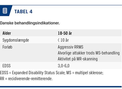 Patientselektion er essentiel for at opnå den bedst mulige prognose og den mindste risiko for behandlingsrelaterede dødsfald. EBMT beskrev i 2012 den ideelle patient som en patient med RRMS med kliniske og radiologiske tegn på høj inflammatorisk aktivitet og forværring af symptomerne trods en eller flere godkendte behandlinger [8]. I Danmark er behandlingsindikationen (Tabel 4) formuleret i henhold til dette, og patienterne tilbydes som standard lavintensitet (CY), hvorved den bedst mulige effekt opnås med mindst risiko for komplikationer og dødsfald.