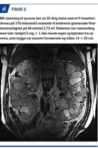Den er karakteriseret ved tilstedeværelsen af multiple væskefyldte cyster i begge nyrer (Figur 1 og Figur 2). Cysterne vokser med tiden i både antal og størrelse, hvilket resulterer i forstørrede nyrer, hypertension og ofte kronisk nyreinsufficiens. På verdensplan er ADPKD af denne grund den fjerdehyppigste årsag til dialysekrævende nyresvigt [2, 3] og ses i Danmark hos 8% af alle patienter, der får dialyse [4]. Sygdommen fører ofte til dialyse eller transplantation inden 60-årsalderen. Med en estimeret prævalens på 1:1.000 [5] anslås der at være ca. 5.000 personer med sygdommen i Danmark; mange af dem er formentlig udiagnosticerede.