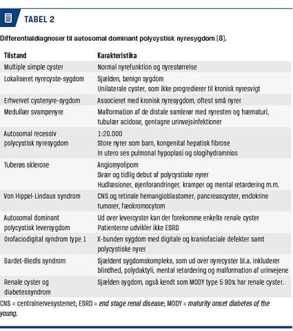 Diagnosen stilles oftest ved ultralydskanning. Hvis der er ADPKD i familien, findes der aldersinddelte kriterier for at stille diagnosen (Tabel 1). 10-15% af patienterne med ADPKD har ikke familiemedlemmer med sygdommen. Dette kan skyldes, at familiemedlemmer har ukendt eller mild sygdom med svag penetrans, at familieanamnesen ikke kendes, at det biologiske faderskab er ukendt for patienten, eller at der er tale om en de novo-mutation (6-8% af alle tilfælde [3]). Hvis der ikke er familieanamnese med ADPKD, skal differentialdiagnoser og herunder en række sjældnere syndromer overvejes (Tabel 2). Før man udreder familiemedlemmer til patienter med ADPKD med ultralydskanning, er det vigtigt at informere om, at diagnosen ADPKD kan forringe muligheden for at tegne livsforsikring og pension [9]. Alle patienter, som opfylder de kriterier, som er nævnt i Tabel 1, bør henvises til en nefrologisk specialafdeling, også på baggrund af fremtidige mulige behandlinger. Ved positiv familieanamnese kan patienten udredes i primærsektoren, men også gerne i hospitalsregi.