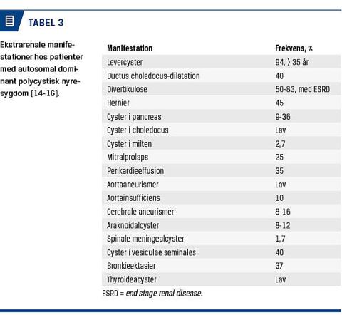 Der er en generel tendens til, at der udvikles forandringer i både kar og bindevæv hos patienterne (Tabel 3). 94% af alle patienter over 35 år har cyster i leveren, hvilket kan give betydelig hepatomegali, men sjældent forårsager leversvigt [14]. Da der findes østrogenreceptorer i levercyster, er kvinder og særligt kvinder, der tager østrogensubstitution og har flere graviditeter bag sig, i højere risiko for at få større cyster i leveren [17]. Hernier kan ses tidligt ved ADPKD, men synes at være hyppigere, når lever og nyrer vokser i størrelse. Herudover er der ved ADPKD beskrevet cyster i en række andre organer herunder pancreas, thyroidea og vesiculae seminales, og der ses en overhyppighed af colondivertikler, aortainsufficiens og mitralprolaps. Mange ekstrarenale manifestationer er tilfældige fund og giver ikke anledning til symptomer. Intrakraniale aneurismer forekommer hos 8% af patienterne med ADPKD, men ses hos op til 16% af patienter med ADPKD, hvor en førstegradsslægtning har haft et aneurisme. For patienter, der tilhører sidstnævnte gruppe, anbefales der derfor screening med MR-skanning af cerebrum hvert 5.-10. år i samarbejde med en neurokirurgisk afdeling [9].