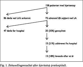 Af de 158 patienter, som havde hjertestop ved LA's ankomst, blev 86 patienter umiddelbart erklæret døde, uden genoplivningsforsøg fra lægeambulancens personale (Fig. 1). I denne gruppe indgik patienter med sikre døds-tegn samt de patienter, hvor CPR skønnedes udsigtsløs.