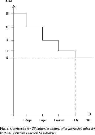 At 13 patienter (18%) ud af 72, hvor avanceret CPR blev udført, lever mere end et år, er også bedre end i undersøgelserne fra København fra 1988 (10) og 1991-1993 (13), hvor man i 1988 fandt, at 21 ud af 177 (12%) var i live efter et år, og i 1991-1993 fandt, at 54 ud af 464 patienter (12%) var i live efter et år; dog finder man i undergruppen med VF en etårs-overlevelse på 16%. I Bonn-undersøgelsen (12) fandtes fra 4,5% til 15,9% ved henholdsvis ikke-bevidnet og bevidnet hjertestop.