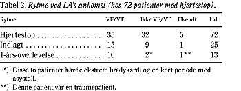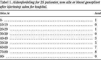 Materiale og metode: Retrospektiv analyse af indsamlede data relateret til hjertestop fra lægeambulancen. Dataindsamlingen blev foretaget af lægerne ved læge-ambulancen Århus, Århus Universitetshospital, i perioden 1.1.1998-31.12.1998. Ved 4.725 udrykninger i 1998 havde 515 patienter kardiovaskulære sygdomme, heraf havde 158 patienter hjertestop. Behandlingsprincipperne ved hjertestop følger The 1998 European Resuscitation Council guidelines for adult life support.