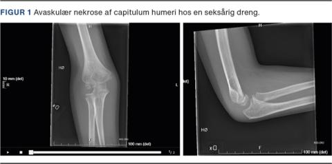 Der blev foretaget en røntgenundersøgelse, som gav mistanke om avaskulær capitulum humeri-nekrose eller Panners sygdom (Figur 1). Efterfølgende for at bekræfte den tentative diagnose blev der foretaget både CT og MR-skanning, som begge underbyggede ovenstående fund.