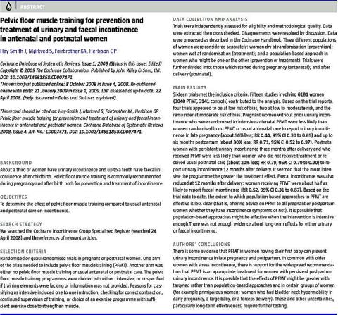 <li>Hay-Smith EJ, Dumoulin C. Pelvic floor muscle training versus no treatment, or inactive control treatments, for urinary incontinence in women. Cochrane Database Syst Rev 2006:(1);CD005654.</li>