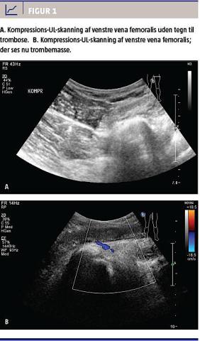 29 mg/l (referenceværdi: < 10 mg/l). Patienten var afebril, der var normalt resultat af elektrokardiogram og upåfaldende arteriegasanalyse. En UL-skanning samme dag viste ikke tegn til trombose i vena poplitea eller v. femoralis (Figur 1A).