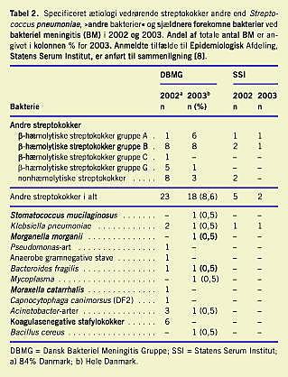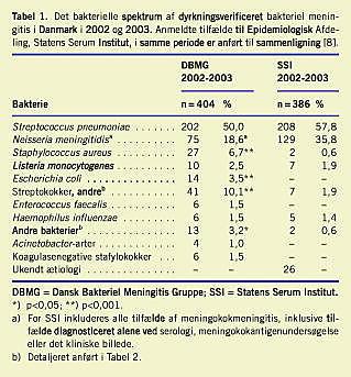 For 2002 omfattede DBMG-opgørelsen 12 danske amter svarende til 84% af befolkningen, mens den i 2003 var landsdækkende. I alt 404 dyrkningspositive BM-episoder blev registreret i toårsperioden. For fire bakteriearter afveg den ætiologiske fordeling begge år fra fordelingen af tilfælde, der var anmeldt til SSI: Staphylococcus aureus 6-7% vs. 0-2% (p < 0,001), streptokokker andre end Streptococcus pneumoniae 9-11% vs. 1-3% (p < 0,001), Eschericia coli 3-4% vs. 0% (p < 0,001) og andre bakterier 2-3,6% vs. 0,5-0,6% (p = 0,02) for henholdsvis DBMG-episoder og SSI-anmeldte tilfælde (Tabel 1 ). For meningokokker var hyppigheden ikke sammenlignelig, da man på SSI opgør alle tilfælde af meningokokmeningitis inklusive dyrkningsnegative tilfælde verificeret serologisk, ved antigentest eller alene ud fra det kliniske billede.