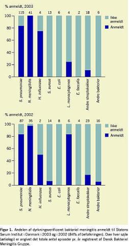 Materiale og metoder: Data vedrørende alle bakterielle fund af klinisk relevans fra cerebrospinalvæske blev indsamlet fra de klinisk mikrobiologiske afdelinger for årene 2002 og 2003. Fordelingen blev sammenlignet med opgørelser af anmeldte tilfælde fra Statens Serum Institut (SSI).