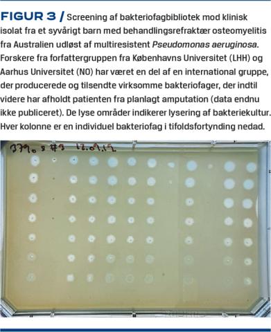 Specifikke bakteriofager, som er målrettet patienternes bakteriestammer er for nylig anvendt flere steder i behandlingen af infektioner med multiresistente bakterier, hvor andre behandlingsmuligheder har vist sig at være utilstrækkelige [15, 16]. F.eks. er multiresistente bakterielle lungeinfektioner med Pseudomonas aeruginosa og Burkholderia dolorosa hos tre lungetransplanterede patienter blevet behandlet med bakteriofagterapi som supplement til antibiotika, og der har været god effekt i form af klinisk fremgang, bakteriedrab og aftagende antibiotikaresistens hos de tilbageværende bakterier [17].