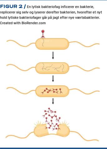 Bakteriofagers »livscyklus« er enten lytisk eller lysogen. Lytiske bakteriofager inficerer værtsbakterier og igangsætter straks produktionen af nye bakteriofagkapsler og kopiering af egne genomer. Når de nye bakteriofagkapsler er samlet og pakket med ét genom, lyseres værtsbakterien for at frigive dem – og bakterien dræbes derved, som vist i Figur 2. Temperate bakteriofager har derimod en lysogen livscyklus, hvor de indsætter deres eget genom i værtsgenomet. Dermed kan de blive reproduceret og videregivet enten ved celledeling, eller ved at bakterien lyseres på et respons fra miljøet [2].