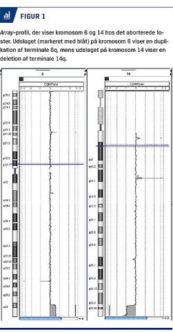 Patienten havde to søskende med mentale handikap. Hendes nuværende graviditet var den første, som hun havde gennemført længere end ti uger. Ved nakkefoldsskanning ved 13 uger + 1 dag var der tegn til hydrops foetalis og fortykket nakkefold på 10,5 mm. Pga. dette blev der foretaget chorionvillusbiopsi med aneuploidiscreening for kromosom 13, 18, 21 og kønskromosomer med kromosom-polymerasekædereaktion (PCR) og efterfølgende array-komparativ genomisk hybridisering (CGH)-analyse. PCR-analysen viste normale forhold hos et pigefoster, hvorimod array-CGH viste to patogene kromosomafvigelser bestående af en ca. 8,6 Mb-duplikation af den terminale del af kromosomarm 6q samt en ca. 5 Mb-deletion af den terminale del af kromosomarm 14q (Figur 1). De påviste kromosomafvigelser blev vurderet at være forbundet med en øget risiko for ansigtsdysmorfi, mental retardering i moderat til svær grad samt medfødte misdannelser såsom hjertefejl og misdannelser i centralnervesystemet. Forældreanalyser med metafase-fluorescens-in situ-