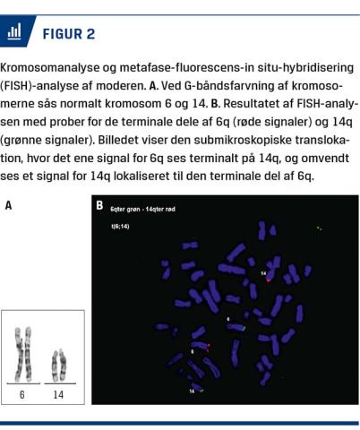 hybridisering (FISH) med prober for de terminale dele af kromosomarmene 6q og 14q viste normale forhold hos vir, hvorimod patienten var bærer af en balanceret translokation mellem de terminale dele af kromosomarmene 6q og 14q (Figur 2). Pga. ovenstående fund ansøgte parret om provokeret abort. Efter tilladelse fra Samrådet blev graviditeten afbrudt. Ved senere genetisk rådgivning blev parret anbefalet graviditet med præimplantationsgenetisk testning. Ligeledes blev invasiv prænatal diagnostik anbefalet pga. den øgede risiko for ubalanceret nedarvning. Patienten har siden fået en rask søn efter in vitro-fertilisering og præimplantationsgenetisk testning. I forbindelse hermed blev tre embryoner undersøgt. Heraf viste to ubalanceret translokation, og et viste balanceret translokation og blev til det fødte barn. Yderligere blev patientens mor senere undersøgt, hvorved man påviste samme balancerede translokation. En ubalanceret nedarvning formodes at være årsag til den mentale retardering hos