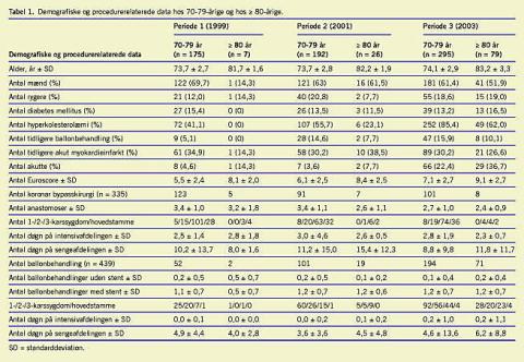 Materiale og metoder: I løbet af 1999, 2001 og 2003 fik i alt 774 fynboer > 70 år foretaget ballonbehandling (PCI) eller koronar bypasskirurgi (CABG). Patienterne blev opdelt efter procedure og alder (70-79-årige kontra ≥ 80-årige). De relevante journaler blev retrospektivt gennemgået med henblik på registrering af deskriptive karakteristika, komplikationer og seksmånedersmortalitet.