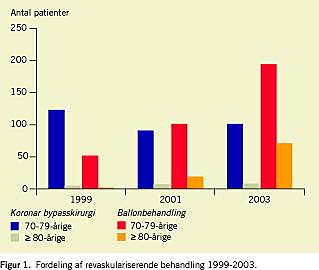 Konklusion: I femårsperioden 1999-2003 er det samlede antal revaskulariserende indgreb hos personer i gruppen af ældre fordoblet. Årsagen er primært en kraftig stigning i brugen af PCI og en øget anvendelse af invasive procedurer i gruppen af ≥ 80-årige. PCI hos ældre er ikke uventet ledsaget af en lavere komplikationsfrekvens, end CABG er.