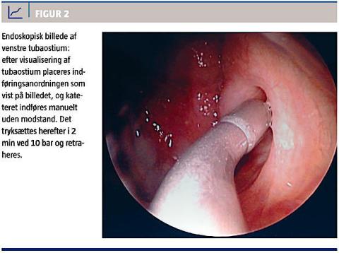 Proceduren udføres normalt under generel anæstesi, men foretages også hos udvalgte patienter i lokalbedøvelse. Ved universel anæstesi anlægges desuden også lokalanæstesi med 4% kokain. Herefter indføres, endoskopisk vejledt, et kateter transnasalt til orificiet i rhinopharynx. Et kateter med ballon indføres under synets vejledning i TA. Der anvendes et Bielefeld ballonkateter (Kebomed A/S, Glostrup), hvis totale arbejdslængde er 355 mm – svarende til, at ballondelen af kateteret er beliggende i den bruskede TA. Ballonen er 3 × 20 mm ved ti bar og tryksættes i to minutter, desuffleres herefter og retraheres (Figur 1 og