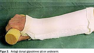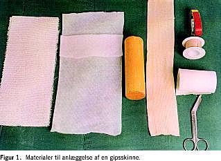 Materialerne til anlæggelse af en gipsskinne er vist på Figur 1 . En stabiliserende gipsskinne kan for eksempel anlægges på dorsalsiden af underarmen efter en ukompliceret Colles' fraktur, som det ses på Figur 2 . Længden af bandagen udmåles med et målebånd, hvorefter polstringen afklippes i den rigtige længde. Det er vigtigt, at der anlægges ekstra polstring ved caput ulna og processus styloidea radii. Den afmålte gipsskinne (8-12 lag) dyppes kortvarigt i vand, hvorefter det overskydende vand stryges af. Håndleddet holdes i 30-40 graders ekstension (funktionsstilling), hvorefter skinnen lægges og modelleres på plads. Der kan eventuelt tildannes og anlægges en håndrem. Når gipsen er hærdet, anlægges et elastisk bind uden stramning.