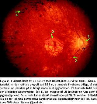 Det mest konstante træk ved BBS er den retinale dystrofi, retinitis pigmentosa, som for BBS skiller sig ud ved på et tidligt tidspunkt at involvere området omkring nethindens gule plet, macula lutea (Figur 2 ) [1, 25]. For patienterne betyder det tab af synsfunktion begyndende med natteblindhed i 4-8-års-alderen progredierende mod blindhed i 2.-3. decennium [21, 24]. I en dansk opgørelse fra 1990 var 50% blinde før 18-års-alderen, mens alle var blinde, før de blev 30 år. BBS-patienterne i denne undersøgelse udgjorde 5% af alle (n = 1.301) danske patienter med retinal dystrofi [26].