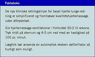 - Lippert FK, Lauritsen TLB, Torp-Pedersen C. Avanceret genoplivning af voksne. Ugeskr Læger 2008;170:3848-51.Handley AJ, Koster R, Monsieurs K et al. European Resuscitation Council guidelines for resuscitation 2005. Section 2. Adult basic life support and use of automated external defibrillators. Resuscitation 2005;67(suppl 1):S7-23.