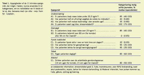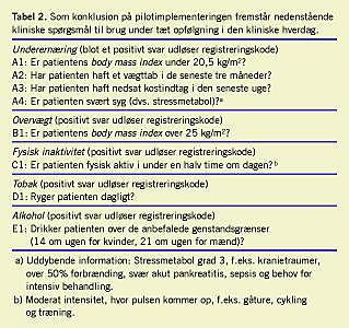 Materiale og metoder: Der indgik 11 kliniske speciallæger fra et bredt udsnit af sygehusafdelinger. De gennemførte først identifikation og registrering af underernæring, overvægt, fysisk inaktivitet, rygning og skadeligt alkoholforbrug ud fra journaloplysninger på egen afdeling (i alt 2.420 gange). Dernæst evaluerede specialisterne forståelighed, anvendelighed og dækning (363 gange).