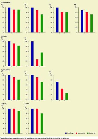 Evalueringen viste, at ni af de 11 kliniske spørgsmål umiddelbart var forståelige, anvendelige og dækkende. B2-spørgsmålet om taljemål og C3-spørgsmålet om øvrigt træningsprogram var forståelige, men vurderedes ikke som værende anvendelige eller dækkende (Figur 2 ).