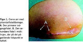 Patienterne har en til flere fistelåbninger (Figur 1 ) lokaliseret præcist i midtlinjen mellem nates, og de strækker sig typisk 3,5-5 cm kranialt for anus [4, 5]. Den mest kaudale fistel ses ofte at indeholde afstødte hår [5]. Fistlerne kan strække sig lateralt ud på nates og palperes som indurerede partier i det subkutane væv [3], og de ender hyppigt i en sekundær fistelåbning. Hårfollikelobstruktion forårsager formentligt mindre åbninger i midtlinjen af crena ani, og afstødte hår presses ind gennem disse åbninger som følge af en kraftpåvirkning fra nates. Dårlig hygiejne, sved og maceration af huden reducerer hudens barrierefunktion og fremmer hårpenetrationen [6].