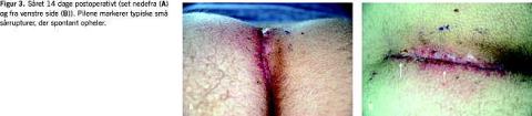Sårruptur er både efter Bascoms operation og andre kirurgiske metoder en hyppig komplikation [16]. De fleste af disse sårdefekter er efter Bascoms operation overfladiske og fra få millimeters størrelse op til maksimalt 0,5 × 3 cm. I 85% af tilfældene helede disse spontant op inden for tre måneder. Det er vigtigt at få lateraliseret såret, så forholdene for ophelingen er optimale. En del af sårrupturerne kan formentligt tilskrives manglende lateralisering som følge af indlæringsfasen. Vi havde i begyndelsen problemer med overfladisk ruptur af sårets anale del hos mere end halvdelen af patienterne, og efter råd fra John Bascom , der havde oplevet samme problem [14], ændrede vi operationsteknikken til den i Figur 2 illustrerede. Vi foretager nu en »hockeyincision« ved anus, så sårets anale del også lateraliseres. Dette har mindsket forekomsten af rupturer i den anale del og dermed også fremmet ophelingen af eventuel sårruptur. Frekvensen af sårruptur i dette studie svarer til opgørelserne i andre studier [16].