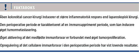 Den perioperative periode er karakteriseret ved, at en del antiinflammatoriske mediatorer, bl.a. transforming growth factor (TGF-β), IL-10 og IL-1-receptorantagonist, bliver frigivet, hvilket bidrager til immunsupprimeringen hos patienterne [26]. Desuden har man i flere studier fundet, at perioden også præges af et øget antal cirkulerende tumorceller, og at disse korrelerer til dårlig prognose og øget risiko for metastaser [26]. Det er derfor undersøgt, hvorvidt det er muligt at opregulere immunsystemet i denne periode for at hindre metastasering. I et eksperimentelt studie blev effekten af præoperativt injiceret IFN-γ undersøgt, og det viste sig, at et øget niveau af makrofager og NK-celler, som blev induceret af IFN-γ, beskyttede mod udviklingen af metastaser ved at eliminere cirkulerende tumorceller [27]. I et andet dyrestudie, hvor mus blev opdelt i en kontrolgruppe, en åbent opereret og en laparoskopisk opereret gruppe, var NK-cellecytotoksiciteten 96 timer postoperativt reduceret signifikant i den åbent opererede gruppe i forhold til den laparoskopisk opererede gruppe [28]. I et studie blev der givet influenzavaccine perioperativt, hvilket førte til en opregulering af NK-celleantallet [29]. Dette kunne danne fundamentet for en ny måde at optimere immunresponset på hos patienter, der skal opereres. Immunsystemet er komplekst og skal ses i en funktionssammenhæng, som i sin helhed ikke er fuldt belyst i relation til kirurgi. Derfor vil det ikke være tilstrækkeligt bare at fokusere på enkelte delelementer i immunresponset. Man bør se på både funktionen af immunsystemet og antallet af celler eller koncentrationen af cytokiner. Med fokus på sidstnævnte tyder de fleste studier dog på, at laparoskopisk kirurgi påvirker patientens immunforsvar mindre end åben kirurgi i den umiddelbart postoperative periode.