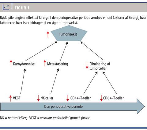 niveauet og niveauet af serum-vascular endothelial growth factor (VEGF) hos patienter med kolorektal cancer [21] (Figur 1). VEGF er en vækstfaktor, der er nødvendig for karnydannelse, og i et randomiseret studie [22] undersøgte man VEGF-niveauet i både peritonealvæsken og serum i en firedages undersøgelsesperiode og fandt ingen forskel imellem gruppen, som var opereret ved åben kirurgi, og gruppen, som var laparoskopisk opereret, men i serum var VEGF-niveauet lavere hos laparoskopigruppen end hos den åbne gruppe på POD2 og POD4 [22]. Serumniveauet af VEGF kan dog have været misvisende, da det kan have været kunstigt forhøjet, idet VEGF i forbindelse med traumet kan frigives fra granulocytters og trombocytters granula. Plasmaniveauet er derfor mere korrekt at måle. I flere studier er der påvist en sammenhæng imellem øget VEGF-niveau og dårligere prognose hos patienter med kolorektal cancer [23]. Årsagen er, at VEGF medierer øget tumorangiogenese [24], og dette indikerer dermed, at laparoskopisk kolorektal cancer-kirurgi muligvis medfører en reduktion i den øgede tumorproliferation i forhold til åben kirurgi.