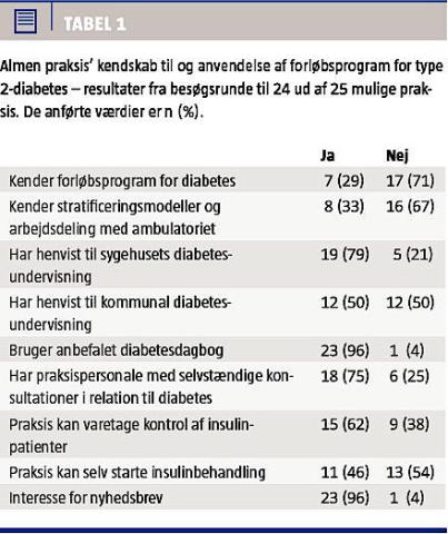 Ved besøgsrunden i almen praksis besvarede de praktiserende læger og deres personale en række spørgsmål fra de to projektsygeplejersker (Tabel 1). Stratificeringsmodellen og forløbsprogrammet var ret ukendt, og der var relativt få henvisninger til især de kommunale tilbud. I ca. to tredjedele af praksisserne kunne man varetage kontrol af patienter i insulinbehandling, og i ca. halvdelen kunne man selv påbegynde insulinbehandling. Der var stor interesse for udsendelse af nyhedsbreve fra ambulatoriet. Besøgsrunden afdækkede desuden et ønske om studiebesøg i diabetesambulatoriet og et ønske om etablering af en fælles elektronisk henvisningsplatform med én indgang til undervisning og rehabilitering i kommunerne og på sygehuset.