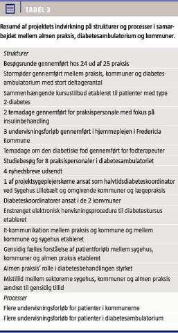 Formålet med projektet var således at forbedre strukturer og processer i samarbejdet mellem almen praksis, diabetesambulatoriet og kommunerne, men ikke at dokumentere forbedringer af behandlings
