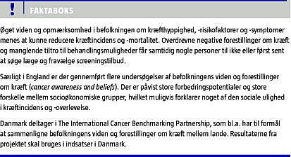 Summary People's cancer awareness and beliefs Ugeskr Læger 2011;173(40):2493-2496 Lack of awareness of cancer symptoms, cancer risk factors, and erroneous beliefs about cancer may influence delay in presentation of cancer symptoms and thereby treatment outcomes. This paper refers cancer awareness population studies (mainly from the UK) and describes associations between elements of the Health Belief Model and cancer-related health behavior. Denmark is part of the International Cancer Benchmarking Partnership which, inter alia, will examine whether differences in cancer survival across countries can be explained by different levels of cancer awareness and erroneous beliefs about cancer.