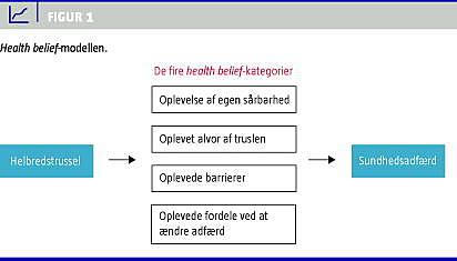 Det er dokumenteret, at individers sundhedsadfærd er påvirket af forestillinger om sundhed og sygdom, såkaldte health beliefs . Health belief -modellen beskriver fire overordnede kategorier af health beliefs : oplevelse af egen sårbarhed, oplevet alvor af truslen, oplevede barrierer og oplevede fordele ved at ændre adfærd [10]. Modellen (Figur 1 ) benyttes ofte, når individers sundhedsadfærd, herunder i forhold til kræft, skal beskrives.