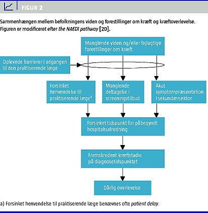 Figur 2 illustrerer konsekvenser af manglende viden samt (for) negative forestillinger om kræft og kræftoverlevelse. Figuren illustrerer, at nogle personers første kontakt til sundhedsvæsenet bliver direkte til sekundærsektoren med akutte problemer (som ofte er forårsaget af mere fremskreden sygdom).