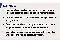 af observationelle studier, og de kohortestudier, hvor man har undersøgt effekten af fosfatsubstitution, er ydermere udfordret af, at P-fosfatkoncentration påvirkes af en lang række terapeutiske interventioner såsom væskebehandling, ernæringsterapi, profylaktisk fosfatsubstitution og flere typer medikamentel behandling [3, 6, 7].