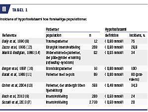 [4, 5]. Øget forekomst af hypofosfatæmi er observeret hos multitraumepatienter [9], brandsårspatienter [10], sepsispatienter [11] og postoperativt hos patienter, der har gennemgået større kirurgiske indgreb, f.eks. åben hjertekirurgi [4, 5, 12, 13] (Tabel 1).