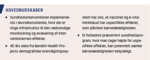 Men vi må ikke glemme, at vores interventioner ikke virker i et isoleret system, men i et komplekst immunsystem, hvor vi kan gøre både gavn og skade. Derfor bør vi udnytte de muligheder, der er, for at evaluere den reelle, samlede effekt af interventioner, som forventes at have gavnlige effekter på den generelle sundhed. Bandim Health Project har i de seneste 40 år undersøgt de reelle effekter af interventioner i Guinea-Bissau, og fundene viser, at enhver ny intervention bør ledsages af en monitorering af effekten på den generelle sundhed og for begge køn.