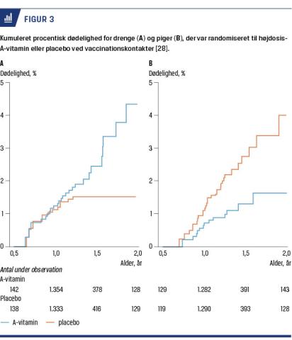 Mens nogle interventioner, herunder vacciner, anbefales uden studier af effekten på den generelle dødelighed, blev effekten af højdosis-A-vitamin på dødelighed undersøgt i 1980-1990’erne. I en metaanalyse af otte randomiserede forsøg af A-vitamin versus placebo i 1993, fandt man en 23% reduktion i den generelle børnedødelighed ved tilskud af A-vitamin [20], og WHO anbefalede derfor at give A-vitamin hver 4.-6. måned i områder med høj dødelighed. Mekanismen bag effekten var dårligt forstået, og den gavnlige effekt, som sås i seks ud af otte studier, kunne ikke forklares med børnenes A-vitaminstatus [20, 21].