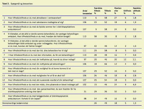 De 15 spørgsmål (Tabel 2 ) kunne gradueres fra særdeles tilfreds, tilfreds, hverken tilfreds eller utilfreds, utilfreds samt særdeles utilfreds. Spørgeskemaet er udarbejdet med inspiration fra forlæg benyttet i Københavns distriktspsykiatri og fra Verona service satisfaction scale, WHO (VSSS-54) [3], samt på baggrund af høring i lokale fokusgrupper af patienter m.m. [4, 5]. Besvarelserne er opgjort ved, at alle svarene på det enkelte spørgsmål er lagt sammen inden for hver graduering og omregnet til procent.