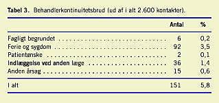 Der fandtes 151 behandlerkontinuitetsbrud (5,8%). Fordelingen fremgår af Tabel 3 .