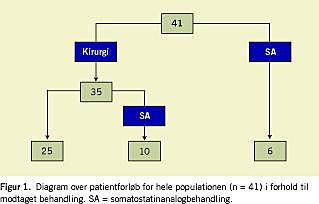 Materiale og metoder: I et retrospektivt design fulgtes samtlige 41 patienter diagnosticeret med akromegali på Århus Universitetshospital i perioden 1994-2004. Femogtredive patienter blev opereret, hvoraf ti efterfølgende blev behandlet med en somatostatinanalog (SA), mens seks modtog SA som monoterapi. Kriterierne for adækvat behandling var reduktion af laveste væksthormonkoncentration (nadir) til < 0,5 μ g/l og/eller normalisering af det tilsvarende niveau af insulinlignende vækstfaktor I (IGF-I).