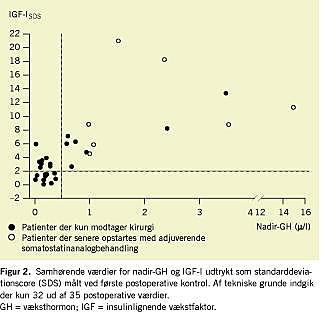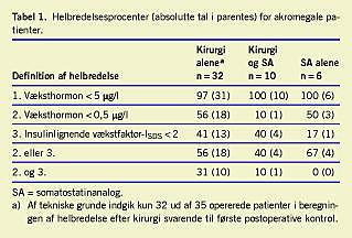 Resultater: Tilfredsstillende effekt af kirurgi opnåedes hos 56%. Resultatet var bedst for små tumorer ( < 10 mm i diameter), hvor 89% af patienterne blev helbredt. I gruppen, som udelukkende blev opereret, faldt IGF-I-niveauet signifikant fra første til seneste postoperative kontrol. Behandling med SA postoperativt var effektiv hos 40%, mens et tilfredsstillende resultat af SA-monoterapi blev opnået hos 67%. For hele populationen var serum-IGF-I-niveauet lavere hos kvinderne både før og efter behandling.