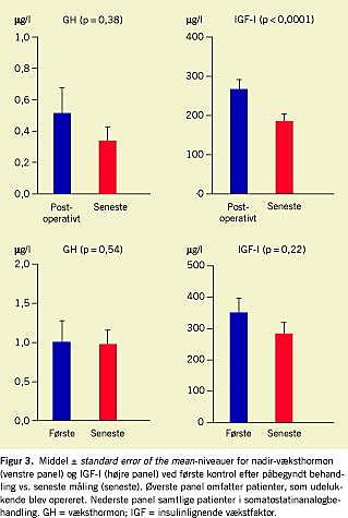 Adjuverende SA-behandling efter kirurgi (n = 10) resulterede i normalisering af enten IGF-I (SDS < 2) eller nadir-GH (< 0,5 μ g/l) hos 40% (Tabel 1), mens en patient opnåede en normalisering af begge parametre. Af de seks patienter, der fik primær SA-behandling, blev fire saneret bedømt på enten IGF-I eller væksthormon, mens ingen opnåede normalisering af begge parametre. Hos denne gruppe var IGF-I-niveauet ved seneste kontrol reduceret med 79% (p = 0,02), mens det tilsvarende GH-nadirniveau faldt med 76% (p = 0,13). Såfremt data samles fra alle patienter, som modtog behandling med SA (n = 16), kunne der registreres et signifikant fald i såvel nadir-GH som IGF-I ved seneste kontrol sammenlignet med niveauerne før start på medicinsk behandling (GH-nadir: 3,06 ± 1,08 μ g/l vs. 0,99 ± 0,19 μ g/l (p = 0,04); IGF-I: 617 ± 64 μ g/l vs. 289 ± 40 μ g/l (p < 0,001)). Derimod faldt niveauerne ikke yderligere under fortsat behandling med SA (Figur 3).
